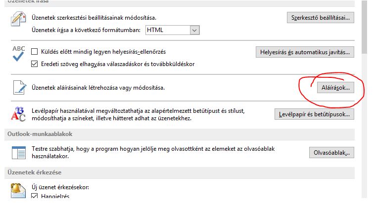 Fájl → Beállítások → Levelek → Aláírások (fentről a harmadik gomb)