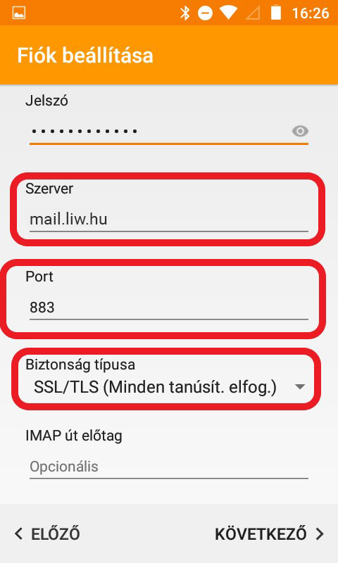 5. Adja meg a „Szerver”-t ami ebben az esetben „liw.hu” a port pedig „883”. A „Biztonság típusa” legyen „SSL/TLS (Minden tanúsít. elfog.)”