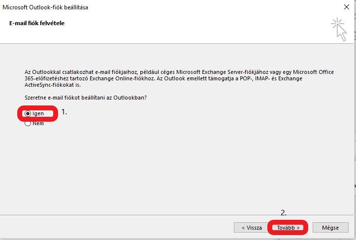 1. Az Outlook 2016 megnyitása után az Outlook rákérdez, hogy szeretnénk-e e-mail fiókot beállítani. Kattintsunk az „igen” opcióra majd a „Tovább” gombra.