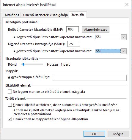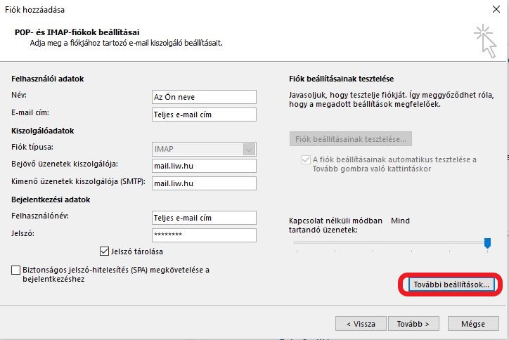 4. A „felhasználói adatok”-nál adjunk meg a nevünket, ez fog megjelenni az email cím előtti névként, ha valakinek levelet küldünk és e-mail címünket. A „kiszolgálóadatok”-nál a „fiók típusa” legyen POP3 a „Bejövő üzenetek kiszolgálója” a „mail.liw.hu” a kimenő üzeneteké szintén „mail.liw.hu. A „bejelentkezési adatok” opciónál a „felhasználónév” az e-mail címünk legyen a „jelszó” pedig a hozzá tartozó jelszó. Majd kattintsunk a további beállítások menüpontra. 5. A „speciális” fülön belül az alábbi beállításokat használjuk.