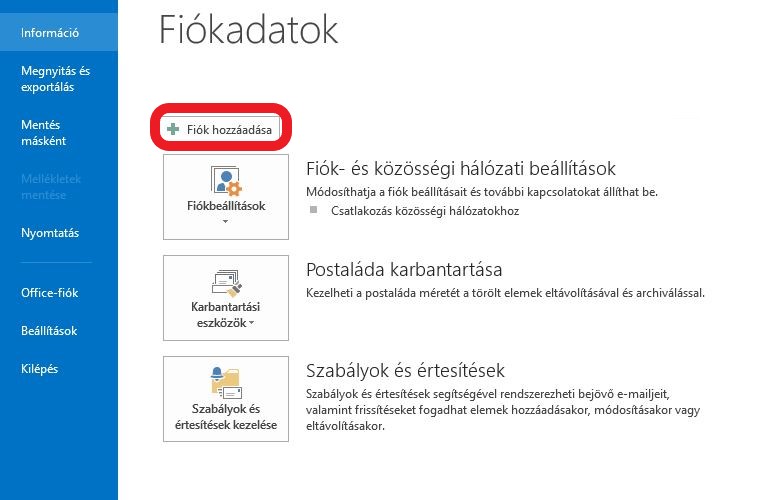 Majd kattintsunk az információ fülön belül a „Fiók hozzáadása” gombra.